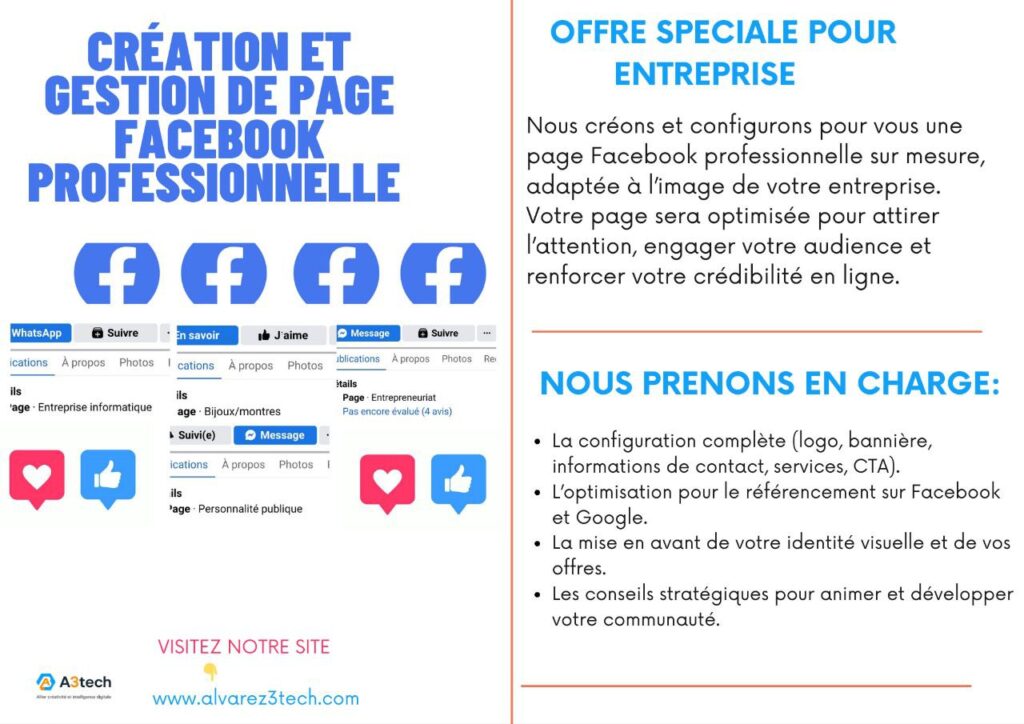 Nous créons et configurons pour vous une page Facebook professionnelle sur mesure, adaptée à l’image de votre entreprise. Votre page sera optimisée pour attirer l’attention, engager votre audience et renforcer votre crédibilité en ligne.