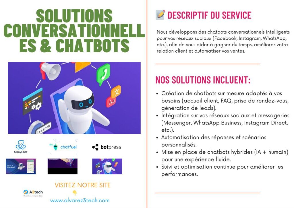 Nous développons des chatbots conversationnels intelligents pour vos réseaux sociaux (Facebook, Instagram, WhatsApp, TikTok, etc.), afin de vous aider à gagner du temps, améliorer votre relation client et automatiser vos ventes.