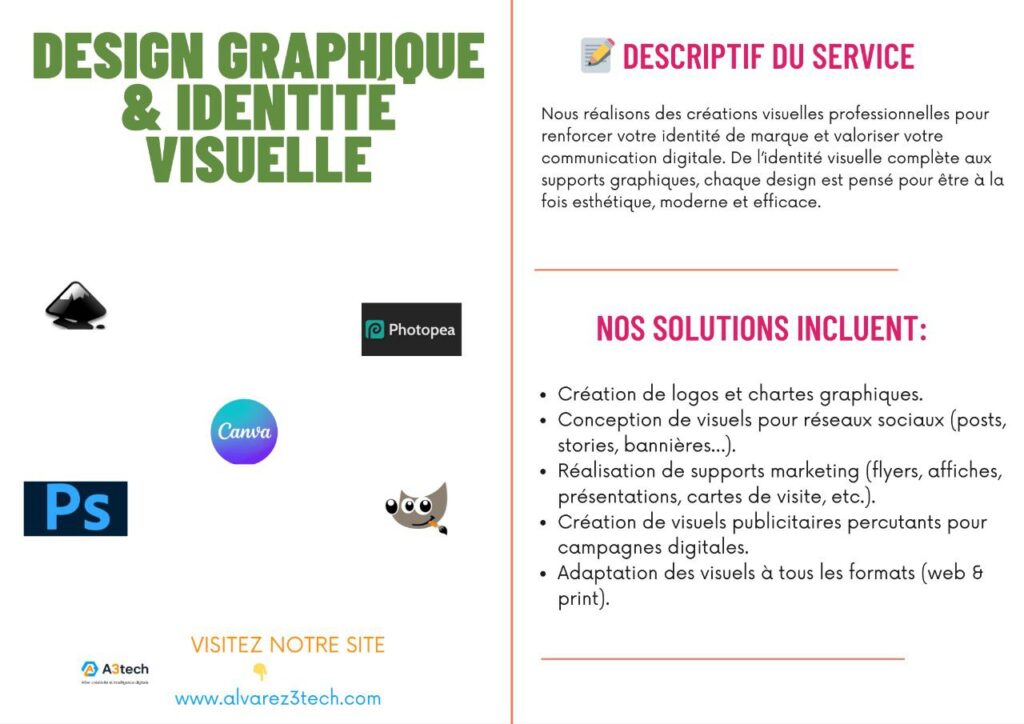 Nous réalisons des créations visuelles professionnelles pour renforcer votre identité de marque et valoriser votre communication digitale. De l’identité visuelle complète aux supports graphiques, chaque design est pensé pour être à la fois esthétique, moderne et efficace.